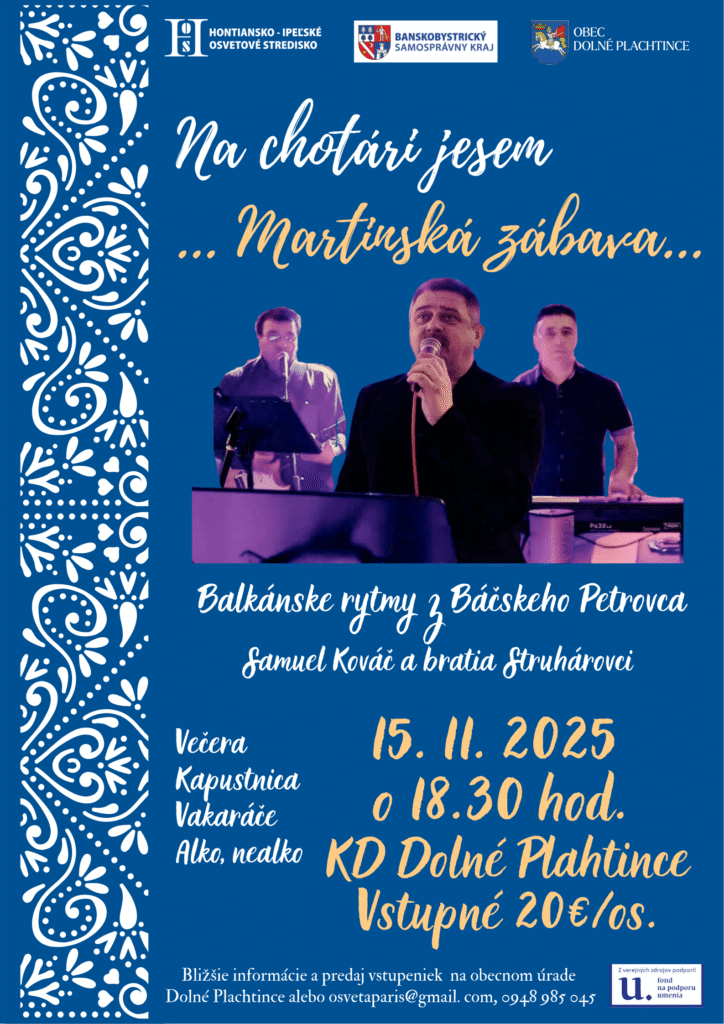 Pozývame Vás na Martinskú zábavu, KD Dolné Plachtince, 15.11.2025 o 18:30. Vstupné 20 Eur/os., O 16:30 bude otvorenie výstavy Čipka v Honte.